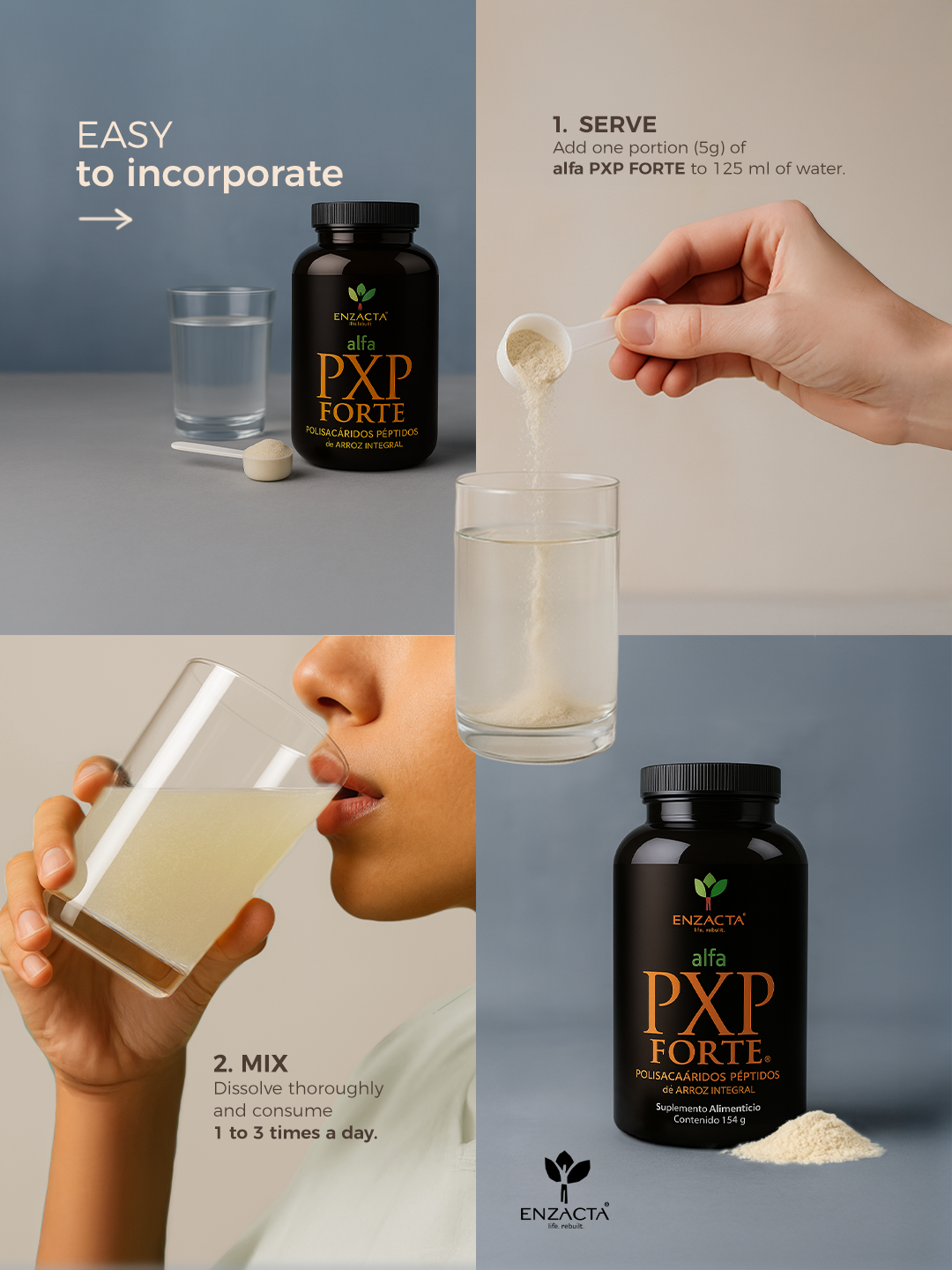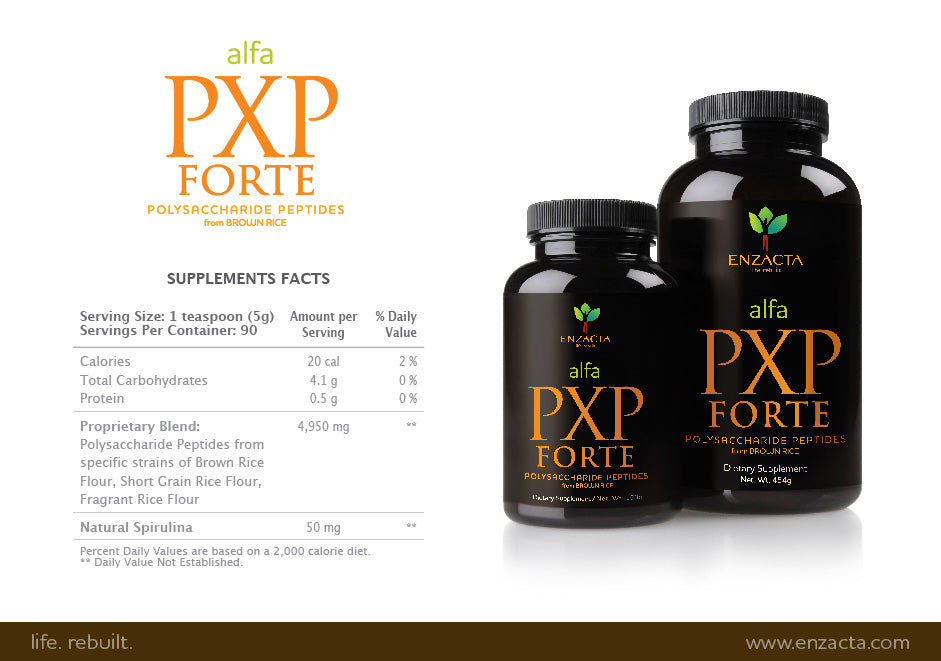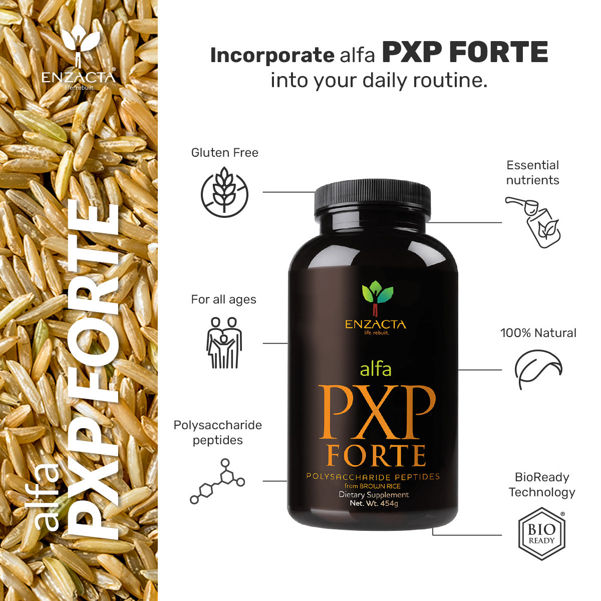 alfa PXP FORTE harnesses all the essential superfood nutrients from brown rice harvested at its best stage. It is a high-quality organic rice from Thailand, rich in peptide polysaccharides, essential amino acids, antioxidants, and enriched with spirulina algae. These ingredients work together to help your body function at its best. Thanks to its BioReady technology, it is absorbed directly by cells.